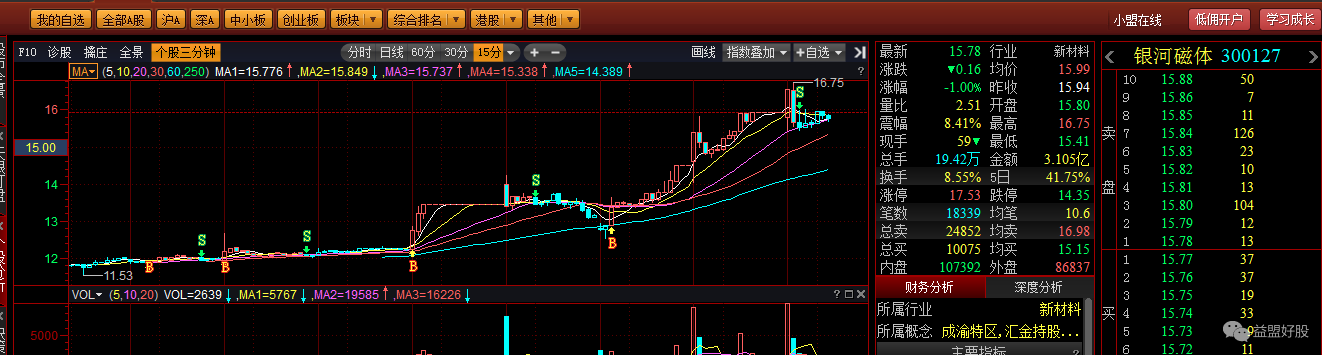 由今天的“天眼盯盘”功能中可以看到,昨天的热点题材稀土永磁,今天又热点退散。震荡市中,益盟操盘手智盈的BS操盘线(买卖)点,可以从日线、60分钟、30分钟、15分钟各种周期,观察个股的持仓期、空仓期。