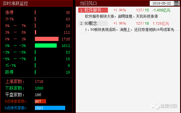 10:02 开盘半小时,整个盘面还是属于比较温和的,涨跌各半,当前比较强的还是5G和软件方面,主要还是受消息影响。