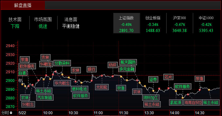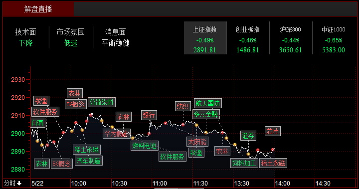 截至收盘,沪指跌0.49%,报收2891点;深成指跌0.51%,报收9041点;创业板指跌0.34%,报收1488点。