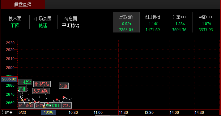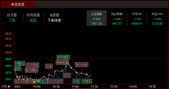 沪指下跌0.84%,报收2867点;深成指下跌1.67%,报收8890点;创业板指下跌1.45%,报收1467点。从盘面上看,稀土、券商、卫星导航等板块涨幅居前;农业、5G、华为海思概念等板块跌幅居前。