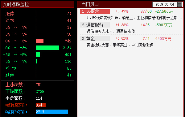 今日A股三大股指低开低走,避险情绪升温,唯有5G概念今日一枝独秀,全天外资继续净流入13.05亿,展望后市,如果市场想要重新活跃,一方面半年线附近缩量止跌企稳信号出现,另一方面新的热点题材重新带动人气,在两者没出现之前,操作建议观望等待时机,切忌盲目追高。