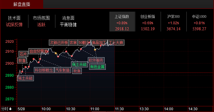 今日早盘大小指数延续强势,个股再现普涨走势,市场情绪回暖,农业、猪肉、创投成早盘资金攻击的主线,但昨天表现抢眼的芯片股有所分化,市场人气股金力永磁7天6板。沪指涨0.89%,报收2918点;深成指涨0.83%,报收9054点;创业板指涨0.69%,报收1502点。截至午间收盘,北向资金合计净流入近38亿元,逆转此前八日持续净流出态势,其中,沪股通净流入33.6亿,深股通净流入4.2亿。