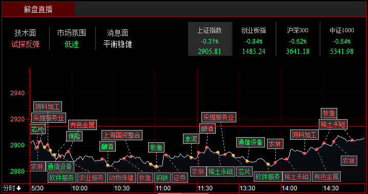 14:45 尾盘农业股再次发力,农发种业和丰乐种业打到板上,另外宏辉果蔬尾盘也大幅飙升,农业股相对来说是今天表现最稳的一个板块。