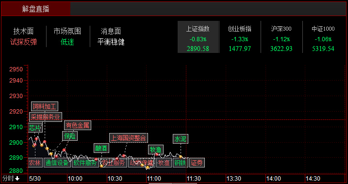09:31 受外围市场集体大跌的影响,今日三大股指集体低开,行业板块跌多涨少,权重股表现萎靡,稀土芯片等热点分化明显,仅农业股表现活跃。