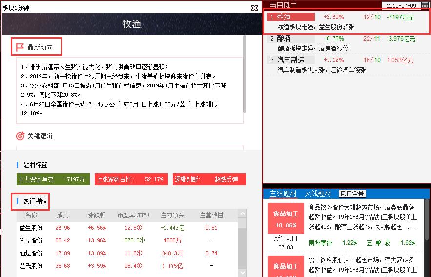 牧渔今日再次站上风口,最近涨的主要还是牧渔里的生猪概念,昨日【策略实战】里也分析了生猪概念的投资逻辑。目前生猪连续4次站上风口,对此版块还是坚持逢低吸纳,不追涨。