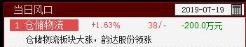 仓储物流站上当日风口,板块异动应该是源于圆通速递(600233)7月18日晚间公告称,2019年6月份,公司快递业务收入为22.9亿元,同比增长21.11%,市场增加对仓储物流行业业绩预增的预期。