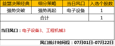 今日【策略+风口】共振共入选1只,电子设备入选1只。由于今天科创板首秀,造成今日主板全面沉寂,仅电子设备与工程机械站上当日风口,入选共振个股也大幅减少,主要原因是市场“镰刀”都跑去科创板互割了,无暇顾及主板。在这样一个弱势行情下,能创今年新高的个股就是市场做多风向标,而工程机械板块的三一重工就是这样一个风向标。以下具体分析。