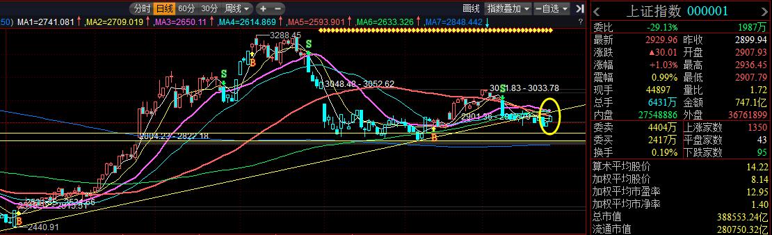 今天大权重表现都很给力,所以指数表现也很强,沪指在上挑60日线(2930点),如果成功突破则有望重新回到上升趋势中。