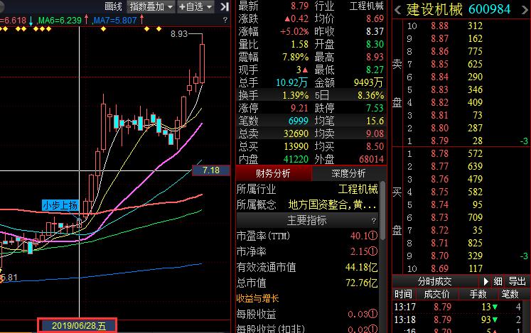 工程机械板块目前两市涨幅第一,该板块已突破4月10以来的高点,今日板块龙1-建设机械600984在6月28日被小步上扬策略捕捉。