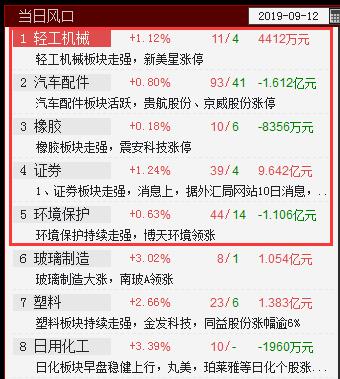 证券、橡胶、汽车配件、轻工机械入选当日风口