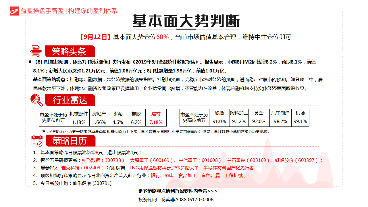今日沪深两市呈现强势震荡格局,指数重心再度上移,沪指创出反弹新高,但量能继续萎缩,节后能否继续上攻要关注是否有新热点产生。展望后市,全球联合宽松趋势可期,在美国降息周期确立,进一步推动全球央行宽松潮,国内政策二次加油,改革深化条件下,A股有望迎来盈利端、资金面和风险偏好预期三重改善。目前市场情绪已明显回暖,适度整固但不改修复反弹的逻辑,但是持续上攻或者大牛市的条件尚未成熟。操作上,坚持“金融+科技”投资方向不变,持续关注政策推动的科技领域,回调时逢低吸入优质龙头企业,注意回避股价短期涨幅过高的股票。
