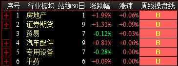 板块方面今日两市操盘线日线处于红色持股状态82家,蓝色持币状态5家,无变化;操盘线周线处于红色持股状态65家,蓝色持币状态22,新增6家持股状态