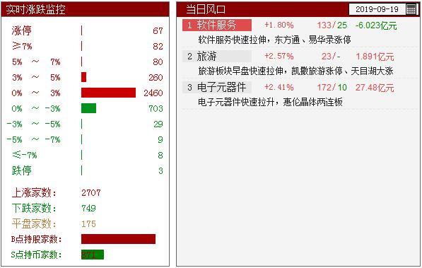 【智盈】软件提示:个股方面今日触及涨停家数67家,触及跌停家数仅3家,操盘线日线今日新发出B点信号家数48家,全部B点持股家数2751家