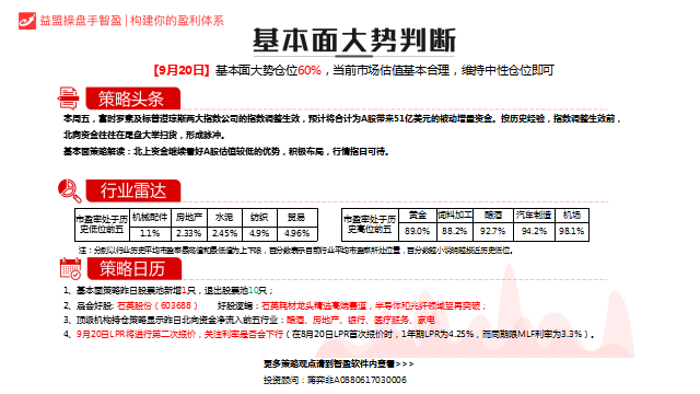 标普、富时罗素同时扩容将于9月23日开盘时正式生效,而今天作为9月23日前的最后一个交易日,外资或集中涌入。另外今天可能还会有资金入场博降息,所填今天大概率偏多。其实行情发展到这里,无需大幅上涨造势,只要不出现大跌,依旧可参与结构性机会。