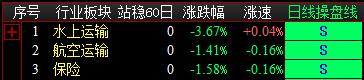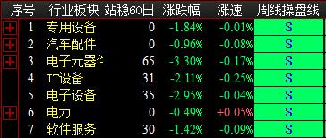 板块方面今日两市操盘线日线处于红色持股状态21家,蓝色持币状态66家,新增3家板块出现S点信号;操盘线周线处于红色持股状态50家,蓝色持币状态37,新增7家板块出现S点信号