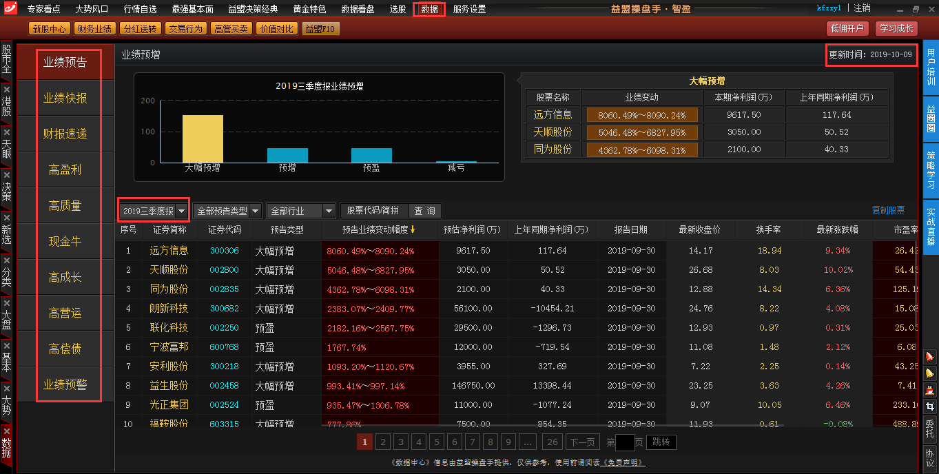 三季报业绩数据可以在【智盈软件】数据中心查看