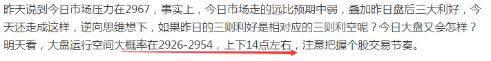 另外,昨日小编在文章《大盘大跌的原因找到了,这类个股必须规避!》中说今日的的运行空间在2926-2957,符合预判,明日看,支撑在2922,压力在2948 2953, 强压力在2962,注意节奏把控