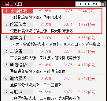 仪器仪表、仓储物流入选当日风口,这两板块也是有短线资金流入,可关注相关个股