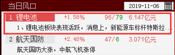 锂电池入选当日风口,消息上,新能源车标杆特斯拉三季度财报大超市场预期后股价接连上涨,概念股受到明显炒作,关注后续走势。