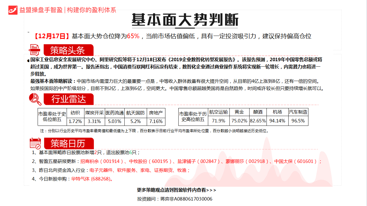今日A股三大股指均强势上涨,大金融板块飙升带动A股继续逼空,市场氛围持续好转,赚钱效应火爆,量能也明显放大,后续不管指数直接走主升浪,还是先横盘再走主升浪,各板块都有大概率被轮动到进行补涨,所以接下来还是持股为主。展望后市,国内宏观政策定调偏暖,中美第一阶段贸易协议文本达成一致,内外部不确定因素集中落地,市场底线抬高,春季行情已提前发动,如果后续经济数据和逆周期调节政策能够配合,那么指数可以高看一线,动力来自于企业利润同比回升和资产配置偏向股市。明年A股有系统性上行的机会,春季行情阶段低估值、高股息的银行地产及有弹性的券商占优,着眼明年全年,利润增速更快的科技和券商表现将会更好。