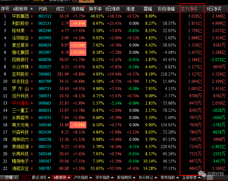 华友钴业、寒锐钴业炒的锂电材料,其它有色股是被带动起来的。今天有色股里面资金净流入前三的是洛阳钼业(3.85亿)、华友钴业(2.39亿0、江西铜业(1亿)。铜、铝在有色中也是弹性较好的品种。
