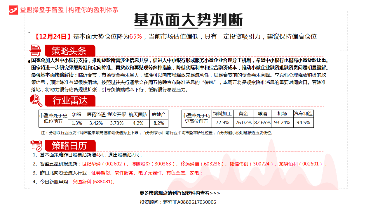 昨日官方明确表态“进一步研究采取降准和定向降准、再贷款和再贴现等多种举措”,市场预期新一轮降准有望于元旦前后落地。这一消息利好银行,银行一旦启动,则有可能带动大盘止跌回升,所以今天的关键就看银行动不动。