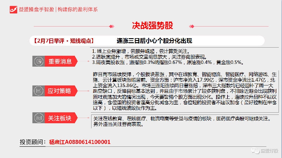 疫情受益概念继续领涨,医疗、消毒剂、口罩、云办公等涨幅靠前;疫情受益概念主要是看数据拐点,拐点一旦来临,相关个股则要考虑兑现,尤其是后排品种,一旦调整起来,先跌的是后排。