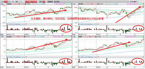 那么对于茅台的强大,给予我们投资者什么样的启示呢?首先,大茅台是中国消费股的标杆,创出新高,对带动大消费行业有积极影响。其次,高价股,这个很好理解,茅台是A股第一高价股,对其他高价品种肯定会有一定刺激,如长春高新。第三,就是趋势类的大股,贵州茅台、长春高新、珀莱雅等等这类趋势股在如此弱势中,持续创出历史新高,可见大资金明显持续在其中活跃。