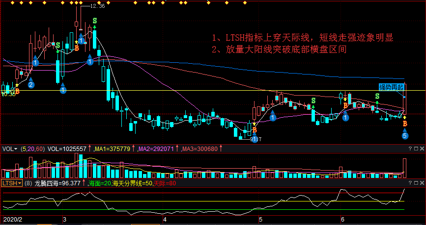 该股今日入选【强势再起】策略池,下图看,前期该股LTSH指标上穿天际线,短线走强迹象明显,其次,放量大阳线突破底部横盘区间,短线止损参考操盘线日线,操作参考操盘线30分钟及60分钟线
