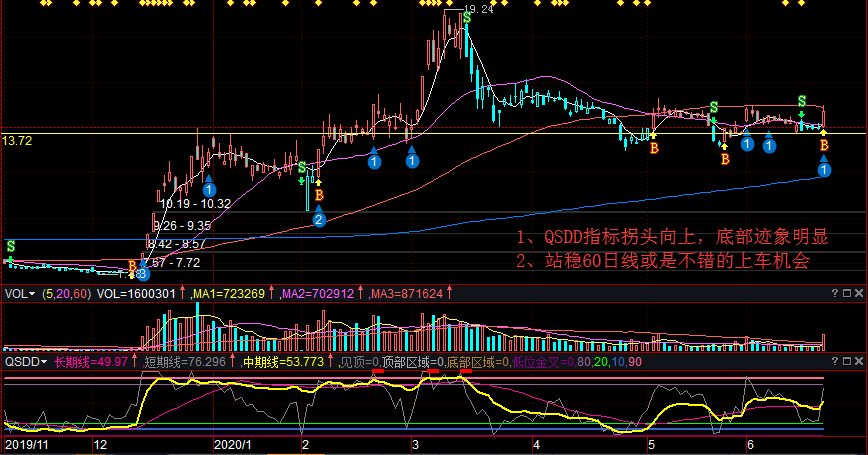 技术拆解:该股QSDD指标中位拐头向上,底部迹象明显,该股好的上车机会应该是站稳60日线,短线止损参考操盘线日线,操作参考操盘线30分钟及60分钟线