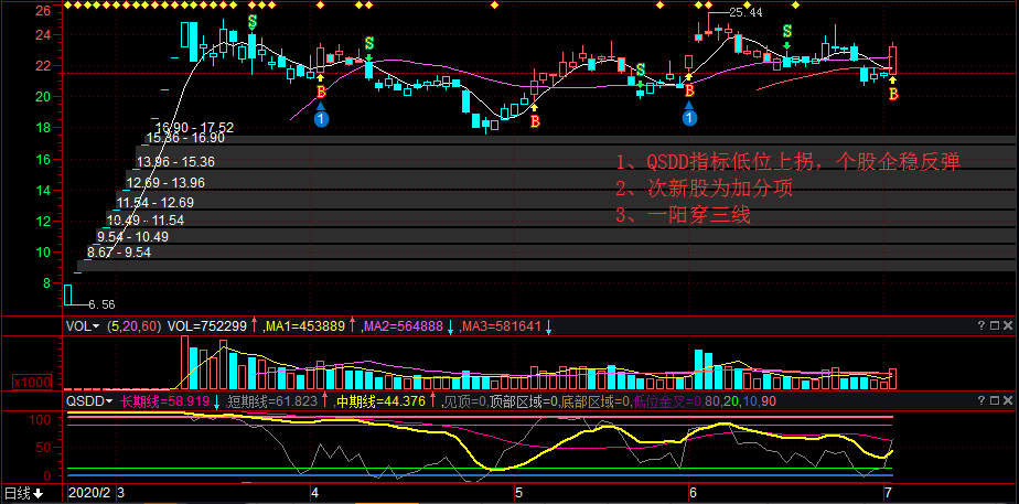 技术拆解:该股QSDD指标低位拐头向上,企稳反弹,其次,该股为次新股,炒新不炒旧,最后,一样穿三线,这种类似于造房子时的立桩,是个股阶段性见底的信号,短线止损参考操盘线日线,操作参考操盘线30分钟及60分钟线