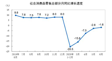 上周公布的数据显示,中国6月社会消费品零售总额同比降幅收窄至1.8%,降幅比上月收窄1.0个百分点市场预期为增长0.3%。