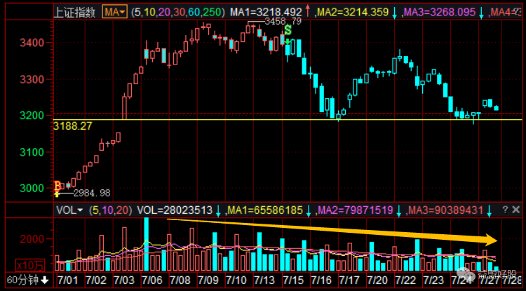 昨日市场缩量十字星险守M形态的颈线位,十七个交易日后,市场成交量首次收于万亿以下,这波行情最大的特点就是成交量的迅速放大,同时成交量也是被技术派看做检验市场行情的有效指标,那么,昨日的缩量是企稳信号还是走向低迷的开始?现在来看,不得而知,就像北资7月14日那天突然净流出150亿以来,至今,内资也没能出现之前的连续净流入,因此,对于行情,我们不能还停留在盲目乐观的的阶段,所有的迹象来看,市场还未到企稳的时候,那么,这时候就需要耐心等待,等待市场给出企稳信号~而现在的阶段,很多好股票已慢慢出现了上车的好时机,加自选,等企稳,如此~