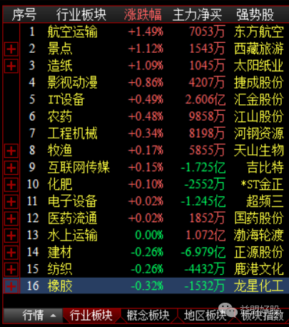 目前行业板块上涨的只有12个,涨幅超过1%的只有3个,排名前2的航空运输和景点是复苏题材。