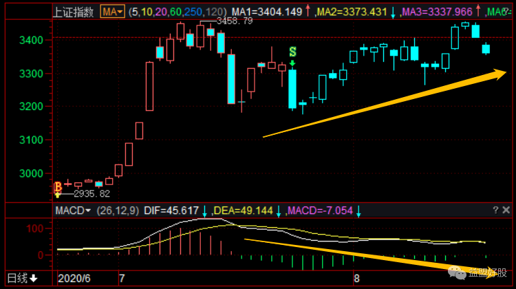 沪指现在处于操盘线S点中,同时MACD指标出现了2次死叉,一般这种都是顶背离的信号,预示行情上涨告一段落。