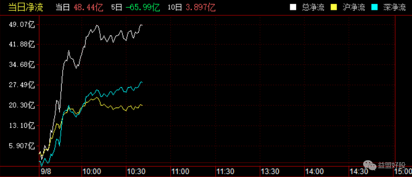 目前北上资金净流入超48亿,叠加大盘指数走势来看,今天上午有点逆势抄底的意思。
