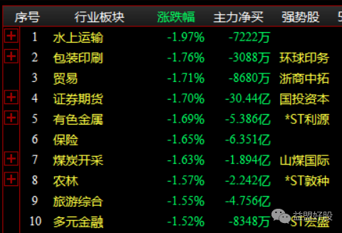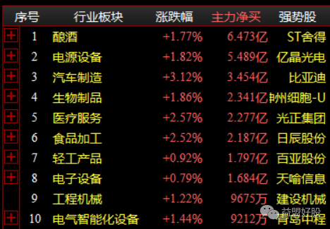 重点板块酿酒分时强势,贵州茅台涨超2%,st股舍得酒业5%涨停,老白干酒、珠江啤酒、青岛啤酒涨幅居前,绩优概念食品饮料板块指数也涨超2%领涨板块指数,天味食品、中炬高新、海天味业、双汇发展涨幅居前。这类板块的上涨对稳定指数帮助较大。