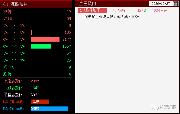 指数反弹,各板块轮番凸凸凸,目前市场情绪良好,涨跌一半一半,饲料加工入选风口