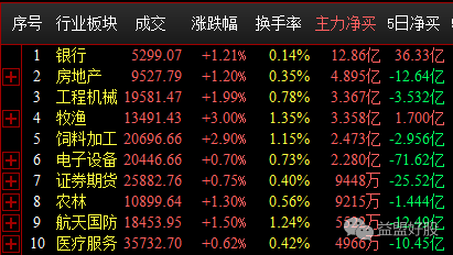 目前资金净买前十,进攻方向银行、地产等,早盘都轮番表现过,还是很明显的