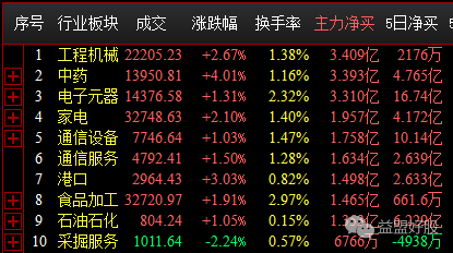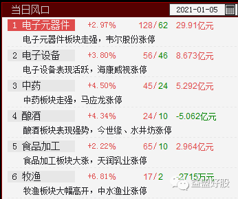 当日风口6板块入选,其中电子元器件+电子设备属于刚起来的板块,可以多加留意