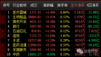 资金净买前十,连续调整的医疗、生物板块或资金青睐