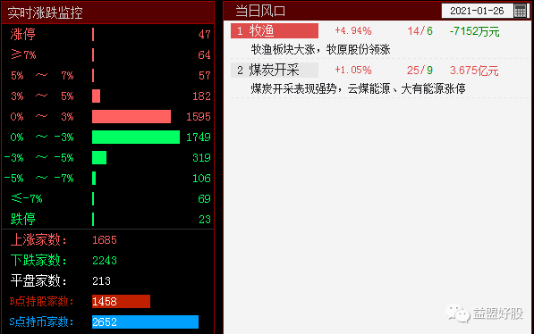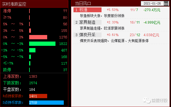 今日市场整体情绪比昨日好,虽然指数持续杀跌,但两市上涨率维持在41.1%,牧渔、煤炭入选风口