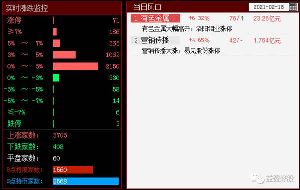 市场早盘高开低走,创业板指跌超3%,个股普涨,近3600只个股上涨,近100股涨超9%,市场赚钱效应较好。板块上,受春节期间原油、铜价等大宗商品价格持续上涨刺激,A股有色、化工、油服等顺周期板块全线大涨,核心是经济复苏逻辑,此外,影视、注册制次新、银行、区块链等板块均纷纷拉升,疫苗股跳水,宁德时代、金龙鱼等创业板权重大幅走弱拖累创业板指;个股上,C曼卡龙一度涨近100%,再现当日翻倍行情,短线情绪表现活跃。盘面上,数字货币、注册制次新、采掘服务等板块涨幅居前,超级品牌、新冠检测、白酒等板块跌幅居前。截至收盘,沪指涨0.39%,报收3669点;深成指跌1.55%,报收15714点;创业板指跌3.23%,报收3303点。沪股通净流入27.16亿,深股通净流入56.77亿。