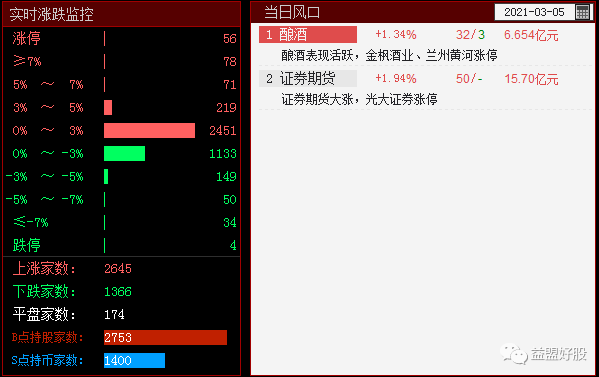 酿酒、证券两大人气板块齐上阵带动市场做多人气,这两个是进攻板块,比基建、银行、保险拉指数更有意义,两市上涨率63.3%