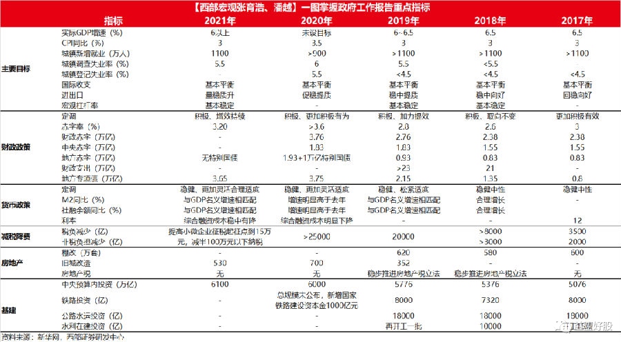 【国信证券:汽车消费、农村消费、新型城镇化建设或是今年政策重点扶持方向】国信证券指出,货币政策方面,政府工作报告延续“不急转弯”基调。财政政策强调提质增效与可持续性,并调低了财政赤字率与地方政府专项债规模,这或许意味着2021年基建投资增速难以明显增长;扩大内需方面,2021年政府工作报告对汽车消费、农村消费、新型城镇化建设投资提出了具体措施或具体数量目标,因此这几个方面或是2021年政策重点扶持方向。